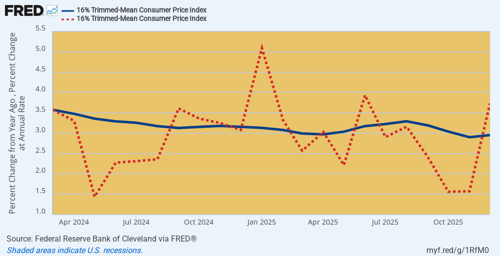 In fact, it’s not remotely booming and there has been no improvement whatsoever in the still high and punishing inflation rate handed off by Joe Biden in January 2025. In fact, the monthly run rate of the 16% trimmed mean CPI had already dropped to 3.58% (dotted red line) under Biden by March 2024. But after y0-yoing to-and-fro since then it actually posted at a 3.73% annualized rate in December 2025.