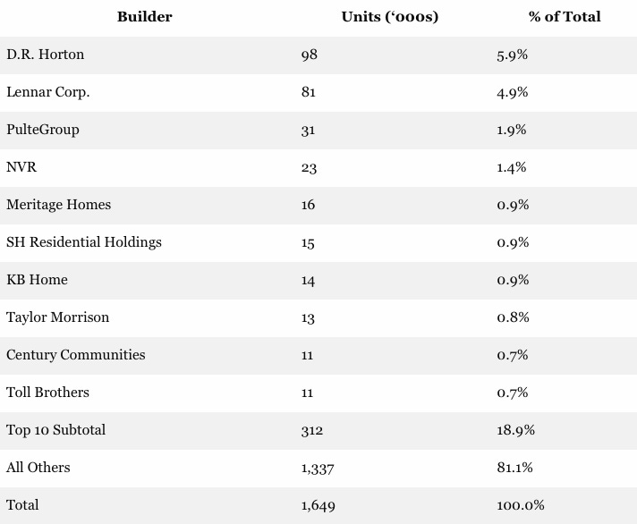 In fact, the largest builder of lower end units, D. R. Horton, supplied less than 100,000 units last year, accounting for only 5.9% of the market. And when you add in the next nine builders, you still get a market share of less than 19% of the 1.649 million units built in the USA during 2024.