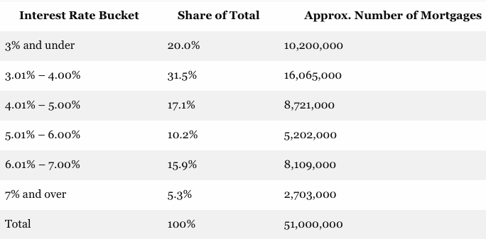 So as a practical matter, no one is going to see nominal 30-year mortgage rates below 5.0% any time soon. What that means is that there are now more than 1o million mortgages locked-in at deeply below market rates of 3.0% or under, while upwards of 25 million or nearly half of all home mortgages outstanding carry rates under 5.0%