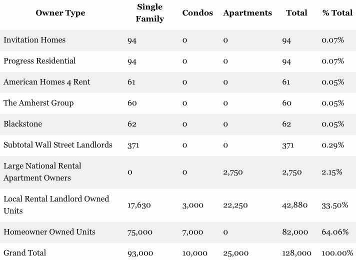 Local/small landlords dominate rental units (~89% of apartments, most SFR/condo rentals).